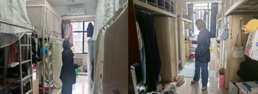 走访过程中,李蔓荻书记与辅导员仔细查看了宿舍的用电安全、消防设施、物品存放以及环境卫生等情况,并与留校同学进行了亲切交流。李书记详细询问了同学们假期的学习、生活安排,叮嘱大家要牢固树立“安全第一”的意识,特别是在假期校园人员相对较少的情况下,更要提高警惕,做好自我防护。