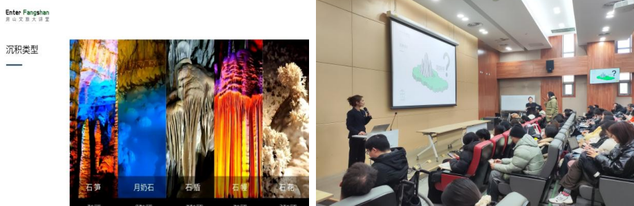 活动伊始,刘双琦老师便以“地质房山”这一主题,瞬间抓住了所有同学的注意力。课堂上,刘老师首先带领同学们“云游览”房山区典型的喀斯特地貌景观,讲解了“十渡”之名的由来,以及北方罕见的峰林、河谷景观。通过壮美的星海、云海图片,展现了其作为“华北天然动植物园”的生态多样性,并揭秘了溶洞的独特形成过程。
